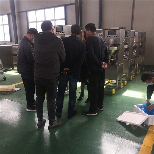 客户是做虾滑丸子的,自带冷冻的馅料进行现场试机,在等待馅料缓化的过程中参观考察设备,公司领导在给客户讲解设备的配置细节